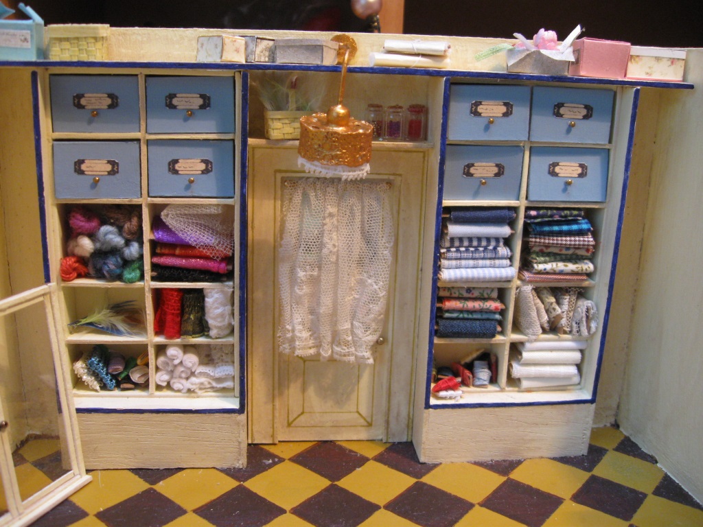 I've always enjoyed making tiny accessories for my dolls so I indulged myself in creating a collection of posh hats with blowsy paper roses and feather trimmings and dainty handbags. Those of you who've done this all before will know how long it took to fill the shelves with fabrics, laces and ribbons and wind fine wool into skeins. Celia's faux glass doors really add to the authenticity and the finest fabrics are kept here. I spent ages making a rather classy mannequin and then promptly covered it up with the frock.....still, I know it's there.